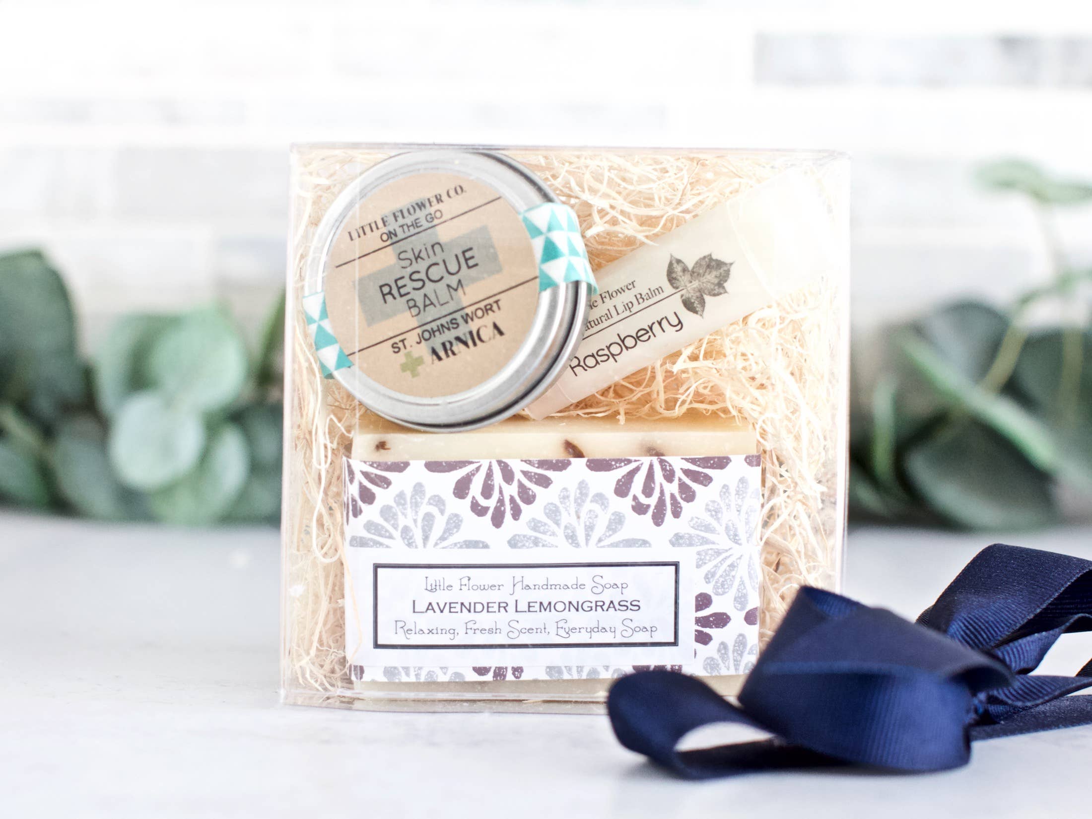 This medium spa gift set includes a 3.5oz Lavender Lemongrass Soap, Raspberry Lip Balm, and 1oz Skin Rescue Balm Tin -OR- Lavender Bath Salt Vial (your choice!) neatly boxed and tied with a bow ready for gifting and looks GREAT on display!