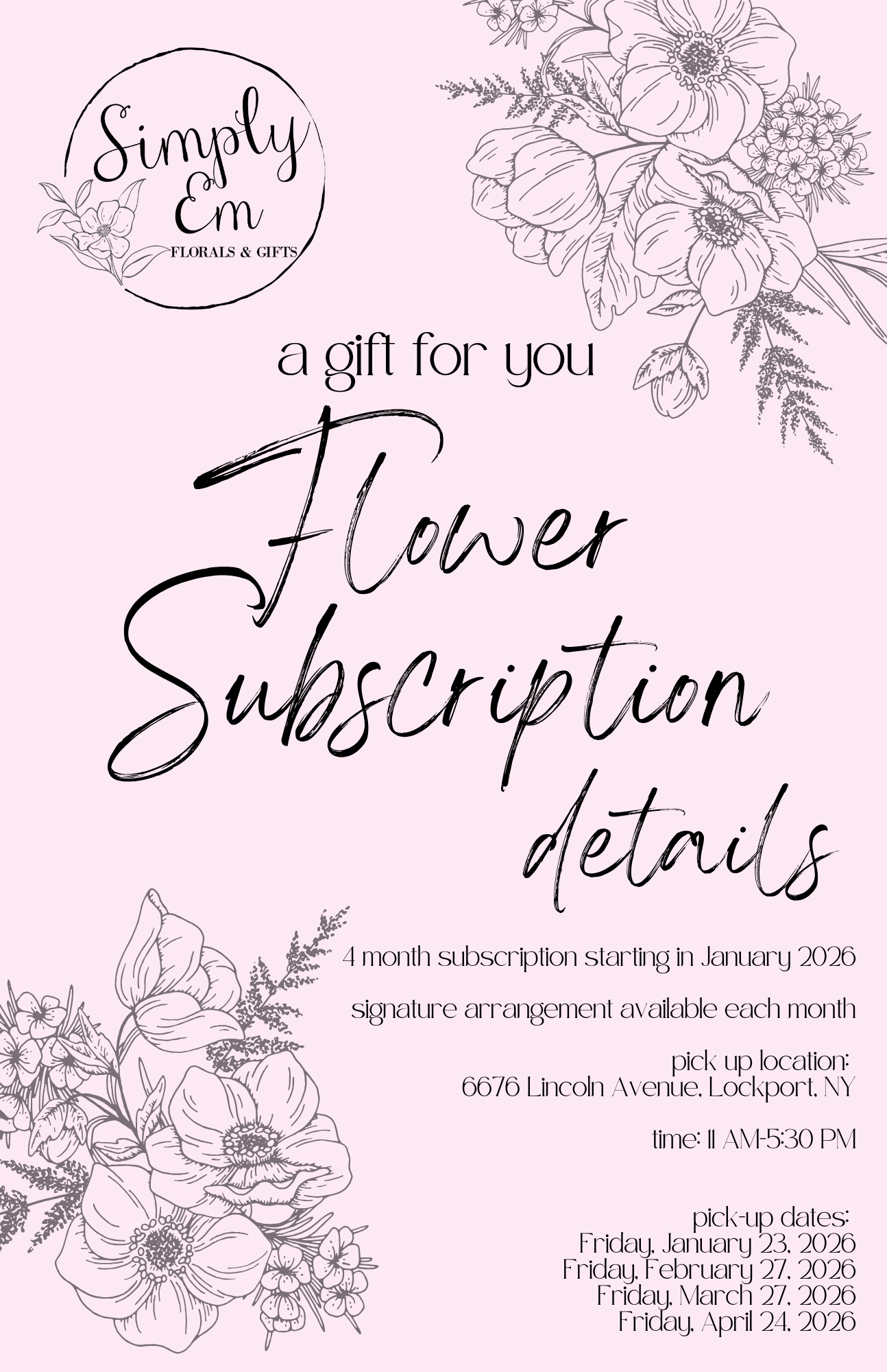 The subscription is essentially 4 arrangements (valued at $55 each). Each month's arrangement will feature fresh blooms and be seasonally inspired-the perfect treat for the winter months.